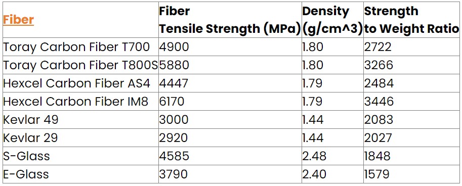 拉伸強(qiáng)度是材料在拉伸時承受載荷的能力。它是纖維發(fā)生永久變形之前所施加的最大力或載荷。如圖所示,碳纖維在強(qiáng)度和重量方面總體上優(yōu)越。然而,S-Glass 和 E-Glass 之間存在顯著差異。就密度而言,凱夫拉纖維是最輕的材料。雖然凱夫拉纖維的極限強(qiáng)度最低,但就強(qiáng)度重量比而言,它超過了玻璃纖維,與碳纖維相當(dāng)。從經(jīng)濟(jì)角度來說,如果極限強(qiáng)度是唯一的設(shè)計標(biāo)準(zhǔn),那么無堿玻璃是最佳選擇。